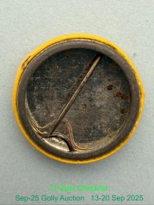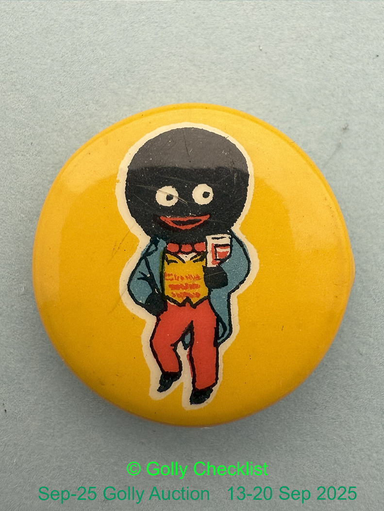 DESCRIPTION: A genuine Robertson's Tin Button Golly badge with a Standard walking Golly with yellow background. 25mm in diameter. This is the early version with smooth hair. No makers name visible.