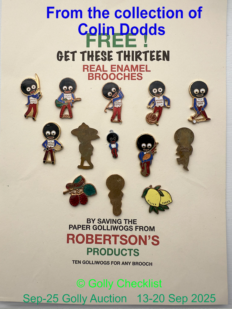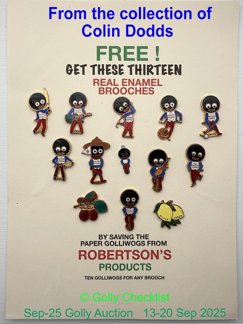 DESCRIPTION: A rare opportunity to add ALL TRADE SPECIMENS to your collection. Certified as genuine by the Golly Checklist team, and mounted on an example of the original showcard this item was put together by Colin Dodds after he carefully amassed an example of each badge over many years. Now offered to one lucky collector, the chance to add them all to your collection in a single lot.
