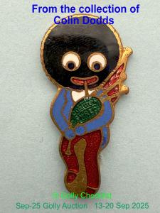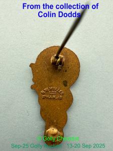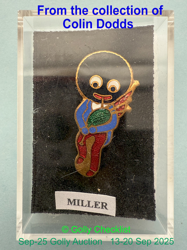 DESCRIPTION: A White Waistcoat Bagpiper badge by Miller. This is the scarce design with GREEN BAG. With light blue jacket. Blue hands and red feet.
