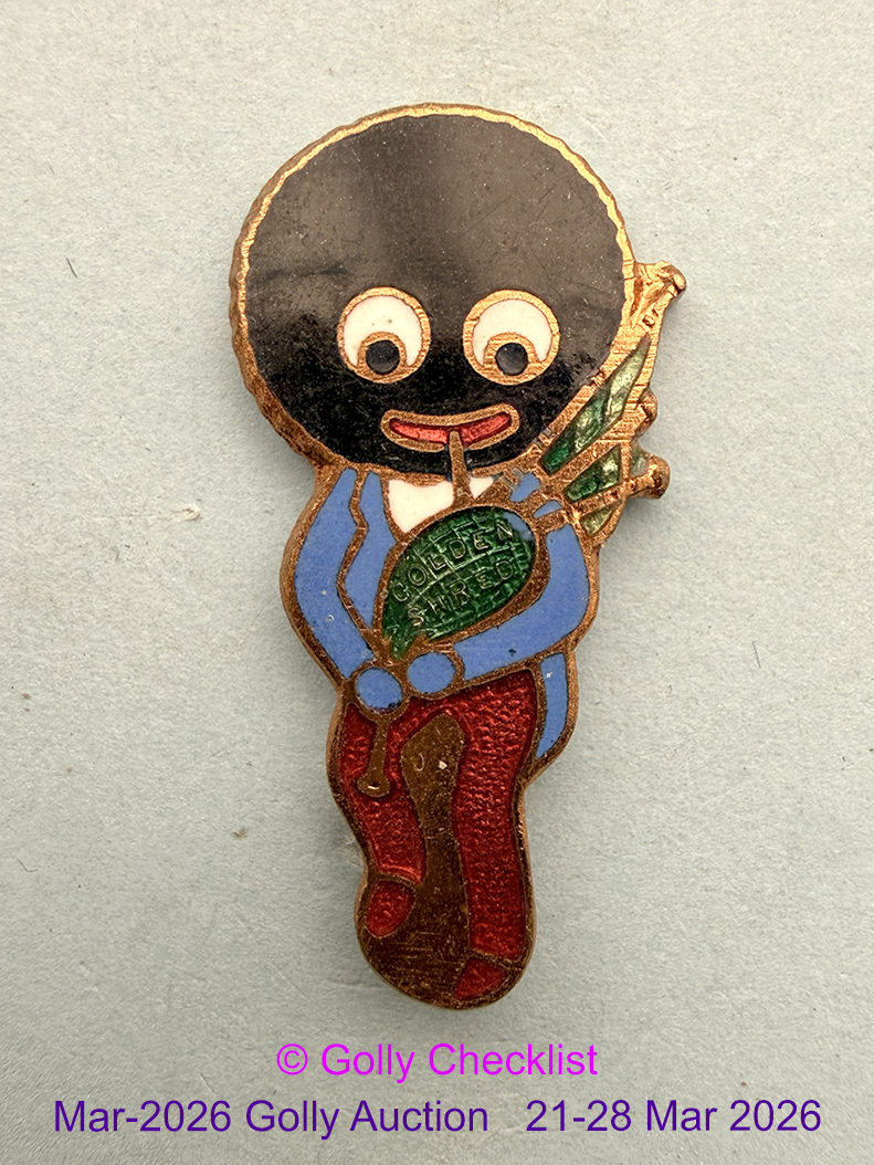 DESCRIPTION: A White Waistcoat Bagpiper badge by Miller. This is the most scarce of all the GREEN BAG designs with the GREEN tassles. With light blue jacket. Blue hands and red feet.