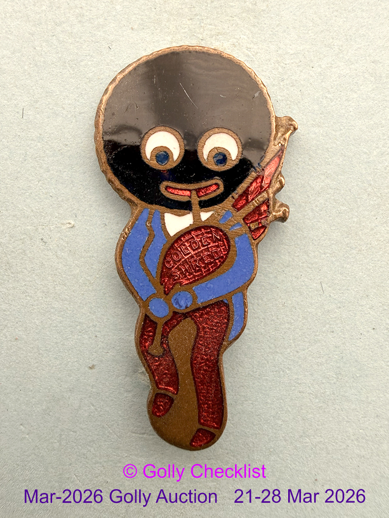 DESCRIPTION: A White Waistcoat Bagpiper badge by Miller. Of the three different coloured bagpipe designs made by Miller this is the rarest, the elusive design with RED BAG. With light blue jacket. Blue hands and red feet.