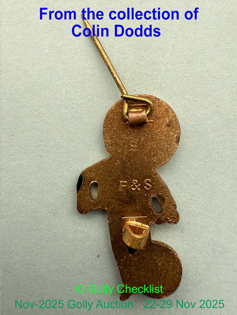DESCRIPTION: A White Waistcoat Footballer badge made by Fattorini with Orange Ball, a light blue jacket, metal hands and feet. This design has the 'F & S' type backstamp.